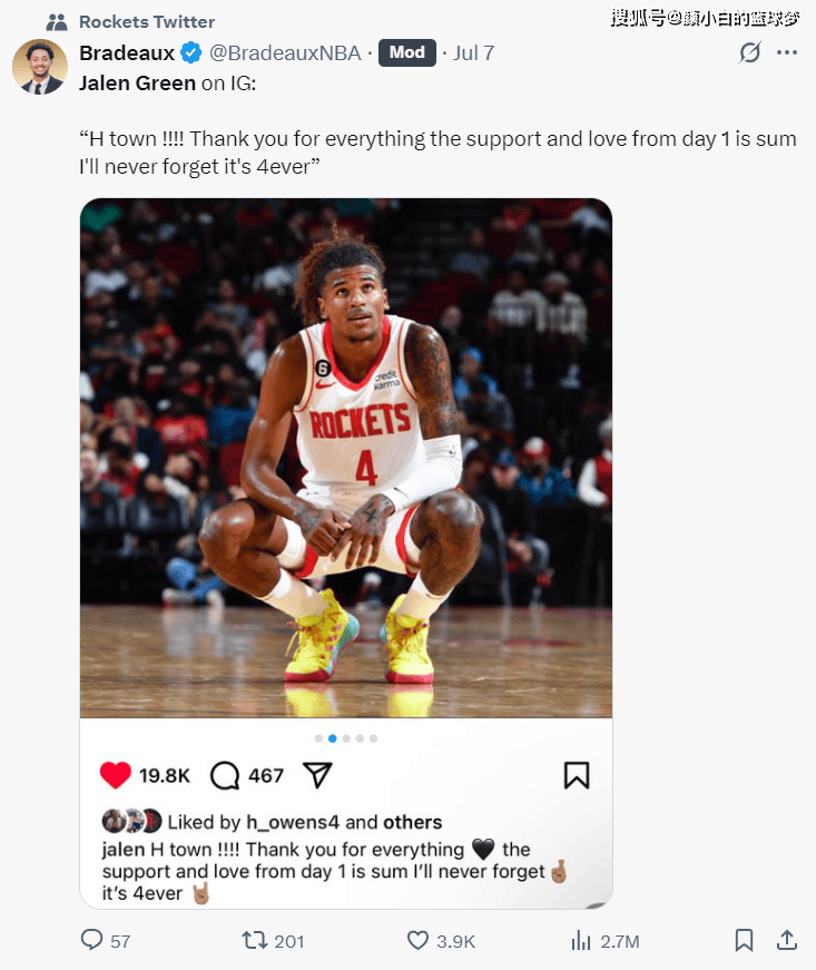 北京时间7月7日晚,杰伦-格林更新了自己的INS他第二次告别火箭,他写道:““休斯顿!!!感谢你们从第一天起就给予我的支持和爱,我永远不会忘记,永远如此。”(早些时候7方大交易达成,火箭队官方已经告别杰伦-格林)