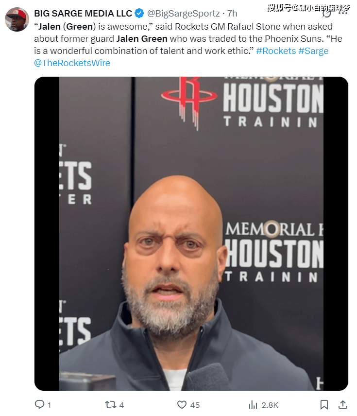 拉斐尔-斯通在北京时间7月8日的新闻发布会上感谢了格林的付出:“JG过去四年从休斯顿开始,他等于是从青少年时期过渡到成熟的NBA球员,他对我们的球队发展、重建起到了重要的作用。场下他与队友、教练、工作人员友善投入,他是我们球队文化的重要组成部分。”