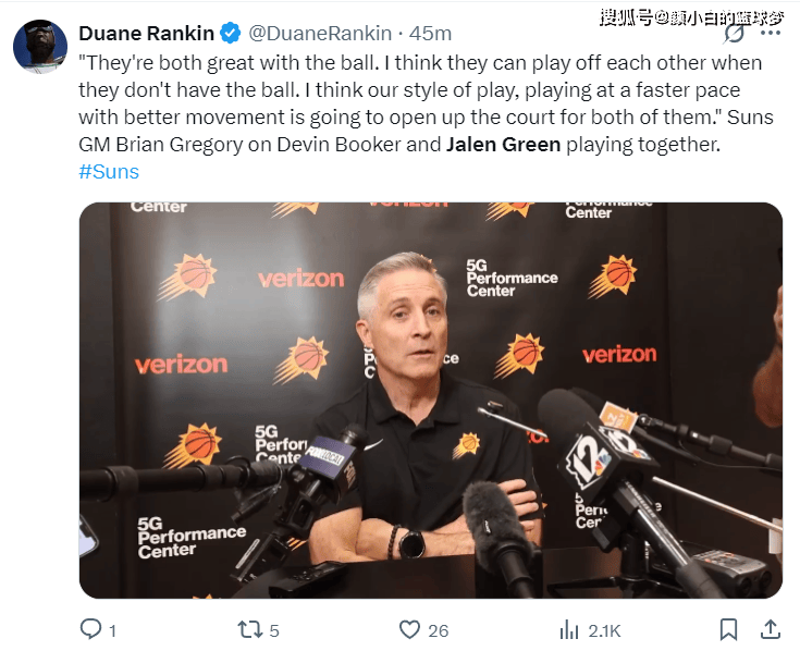 谈到格林与布克搭档先发时,格雷戈说道:“他们两人控球都很出色,我认为当他们一人没持球时也能配合的很好,我们的比赛风格会以更快速度与更好的跑位来开展,球队会为他们拉开更多空间。”