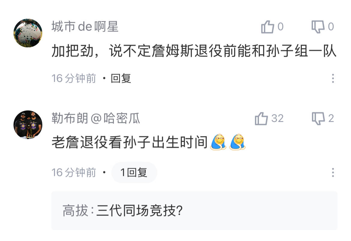 布朗尼在社媒上与女友的甜蜜互动,网友球迷是看在眼里的,有球迷调侃詹姆斯就要当爷爷了;还有球迷脑洞大开,认为詹姆斯退役之前能和孙子组一队,实现三代同场竞技。
