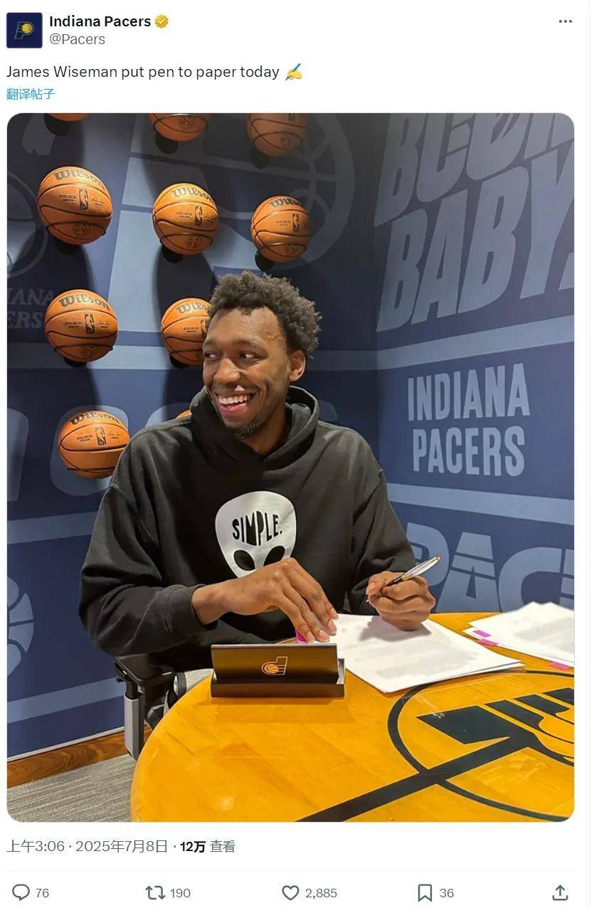 北京时间7月8日,步行者官方宣布:球队正式签下詹姆斯-怀斯曼!昔日的NBA榜眼秀,终于重返联盟。另据媒体报道,这份合同是两年底薪,第二年球员选项,同时是部分保障。步行者动作很快,今天直接邀请怀斯曼过来签字。