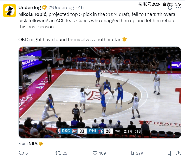 美媒Underdog:托皮奇在2024年选秀大会是状元热门,因为在选秀前ACL撕裂降至12顺位被雷霆捡漏,他上赛季都在OKC养伤,或许雷霆又选中了一位明星球员。
