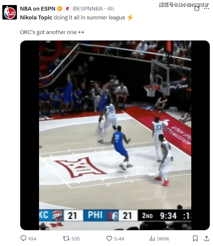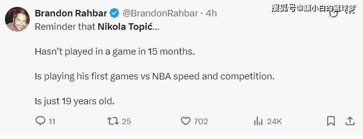 雷霆记者:提醒一下大家托皮奇已经15个月没有打过球了,这是他346天来第二场比赛,而且他今年才19岁。