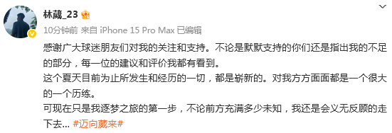 不久前,林葳更新社交媒体发文说道:“感谢广大球迷朋友们对我的关注和支持。不论是默默支持的你们还是指出我的不足的部分,每一位的建议和评价我都有看到。