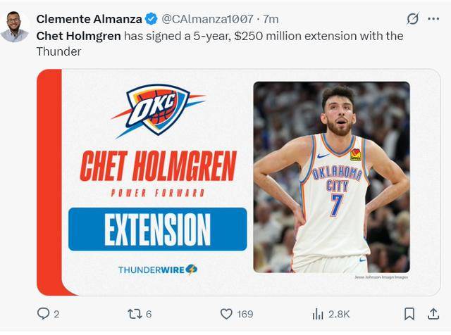 北京时间7月9日晚,根据ESPN名记Shams的报道,雷霆与切特-霍姆格伦达成了一份五年2.5亿的提前续约合同。
