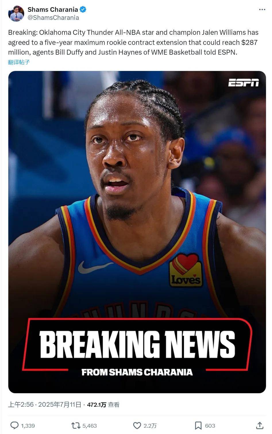 北京时间7月11日凌晨,据NBA名记Shams报道,雷霆与杰伦-威廉姆斯达成5年2.87亿美元的续约合同。这份合同跟魔术给班凯罗的一样,保障金额5年2.39亿美元。如果下赛季入选最佳阵容,哪怕是三阵,即可解锁2.87亿美元。