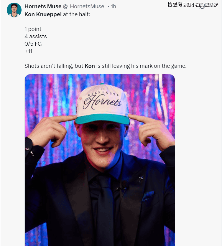 上半场他是5中0,怒砍1分4助攻,正负值+11,黄蜂媒体还表示:虽然得分不佳可还是为我们留下深刻印象。