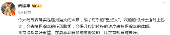 本场比赛参与解说杨鸣点评说道:杨瀚森还是受到背靠背体能影响,稍微有一点脱节,但还是用自己方式在打球,所有球都是合理的,现在是由弱到强过程,还没有碰到又硬又黑,将会可能要面对文班那样的球员。”