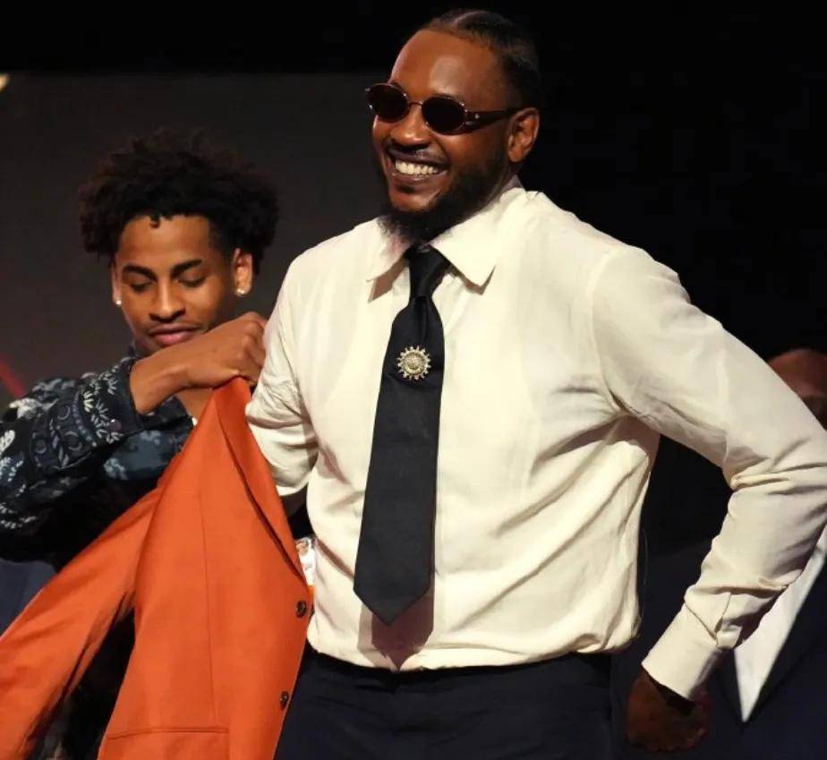 瓜哥的儿子、 雪城大学新人Kiyan Anthony为父亲披上了名人堂专属的橙色夹克。