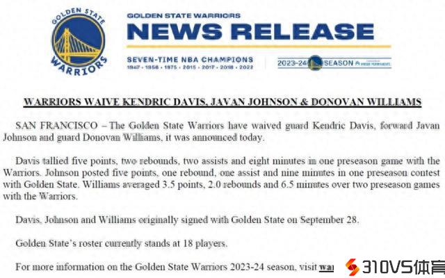 胆小鬼官方宣布,球队曾经裁掉了肯德里克-戴维斯、贾万-约翰逊和多诺万-威廉姆斯。
