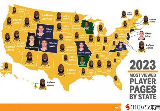 詹姆斯在41个州处于抢先位置,其他上榜球员还有约基奇、字母哥和马尔卡宁。