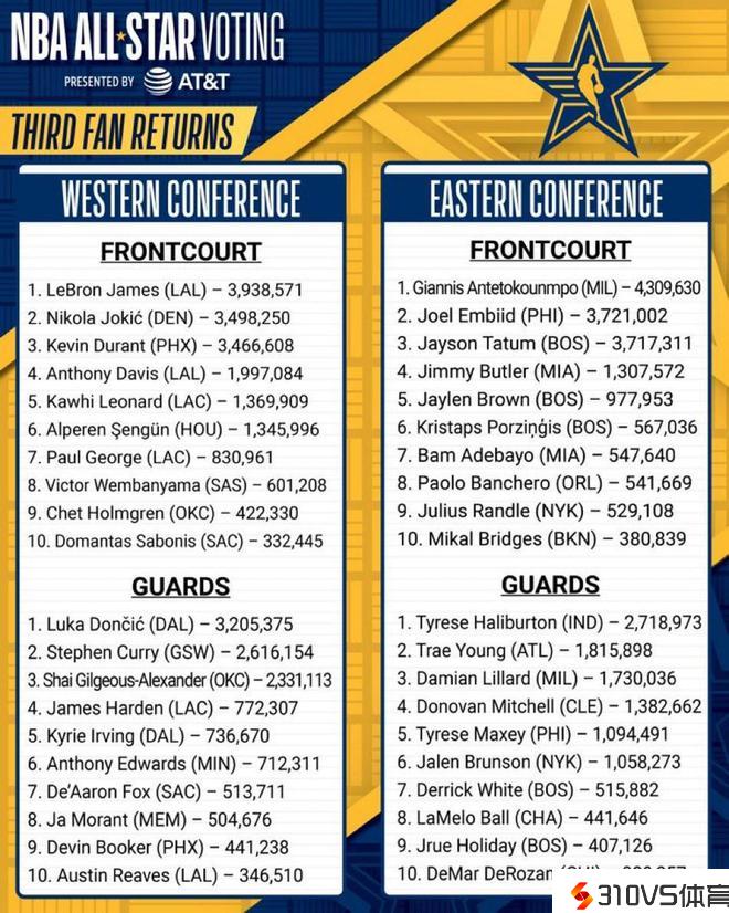 西部前场湖人巨星詹姆斯处于抢先位置,紧随其后的是掘金当家球星约基奇、杜兰特、戴维斯和莱昂纳德等人。后场方面,东契奇票数抢先库里排名榜首,亚历山大、哈登和欧文等人位列之后。