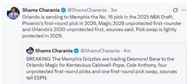 有消息人士透露 ,这四个首轮签都是不保护的首轮签,分别是2025年首轮16顺位、太阳 2026年首轮签、魔术2028年无保护首轮签、魔术2030年无保护首轮、魔术2029年轻度首轮保护互换权。