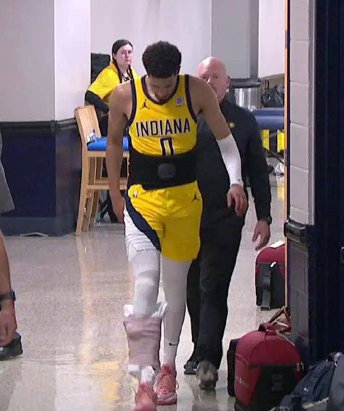步行者最大的隐患在此时显露——哈利伯顿在比赛中疑似小腿不适,曾返回更衣室,随后佩戴护具重新回归赛场。