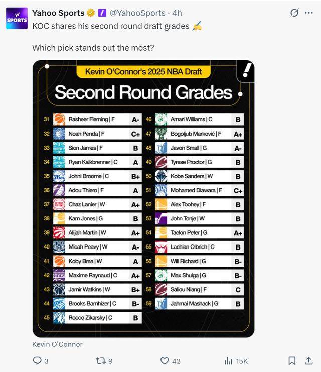 北京时间6月27日,NBA次轮选秀大会完结,今年的次轮选秀有29个签位,尼克斯因为之前的违规被罚掉了次轮所以只有29个,雅虎体育专家凯文-奥康纳也为这29个签位进行了选秀评级。