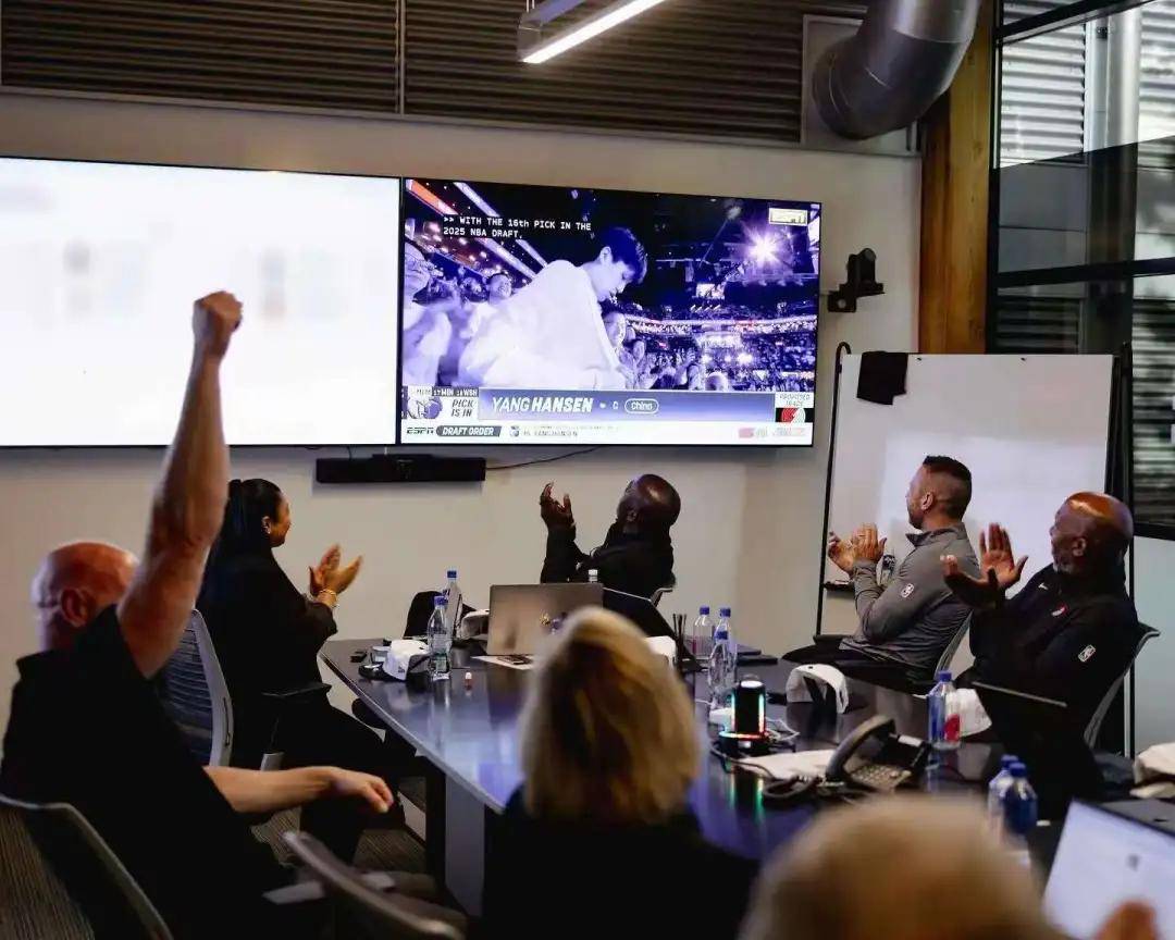 来看看当时开拓者选中杨瀚森后,办公室管理层和教练组的兴奋庆祝的样,就知道开拓者有多稀罕他。