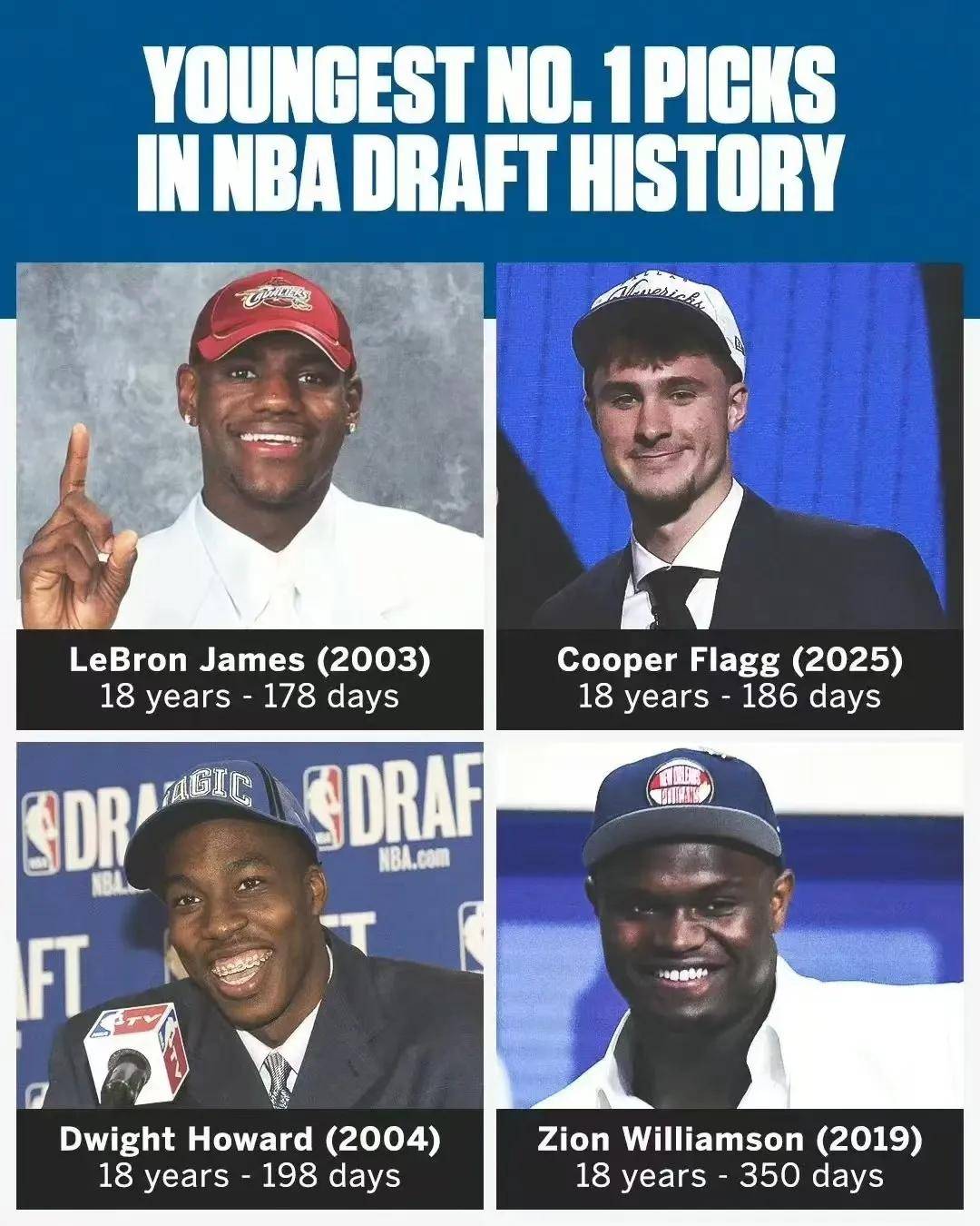 詹姆斯、弗拉格、霍华德、锡安-威廉森,在被选中成为状元秀的时候均只有18岁,这就是天才!