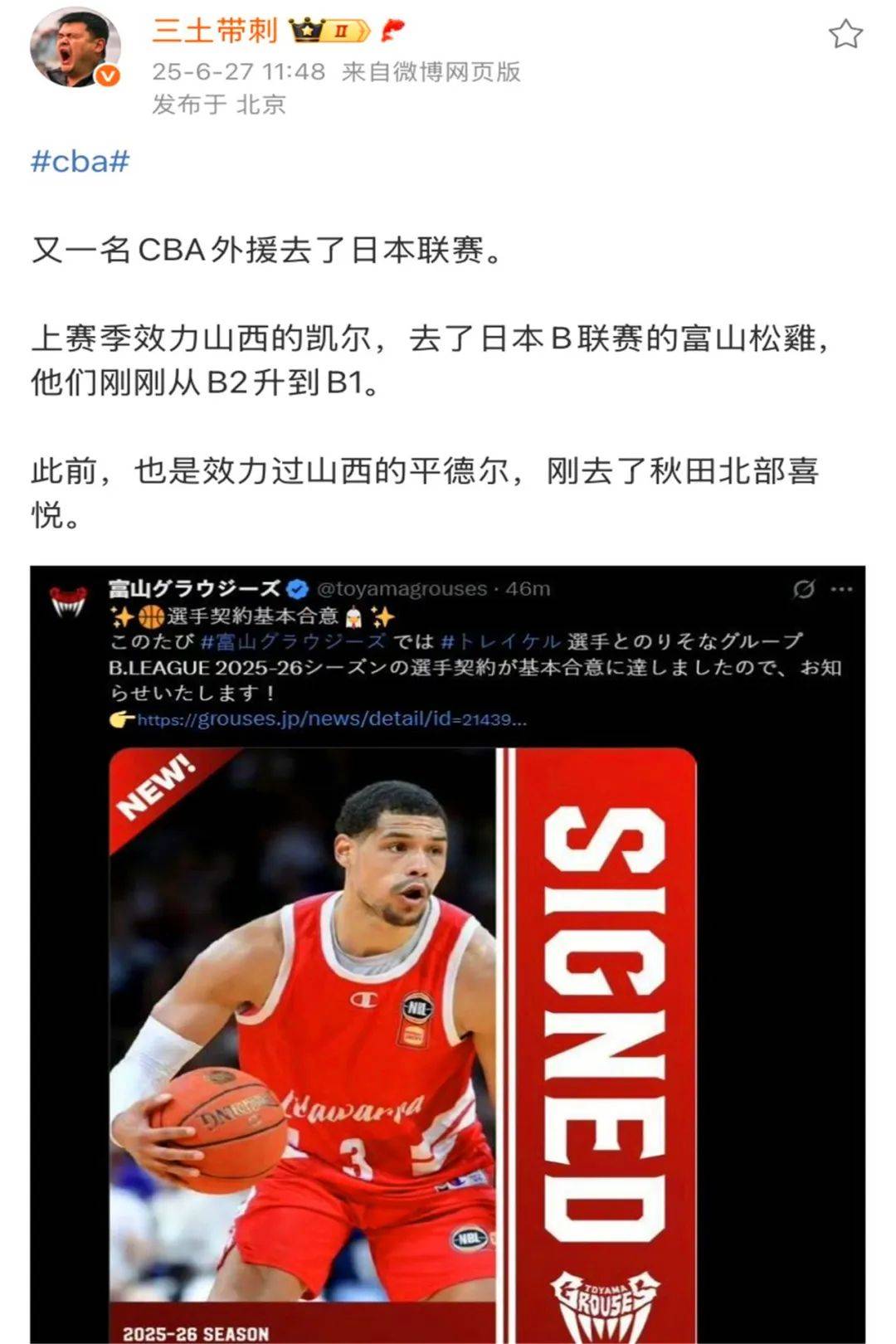 最后,广东队克星凯尔已经正式离队了,根据媒体人三土带刺报道,上赛季效力于山西队的凯尔已经加盟了B联赛的富山松鷄,他们刚刚从B2升到B1。需要注意的是B联赛有着60场常规赛,结束时间比CBA还要晚,故此,凯尔不会出现在山西队中了。