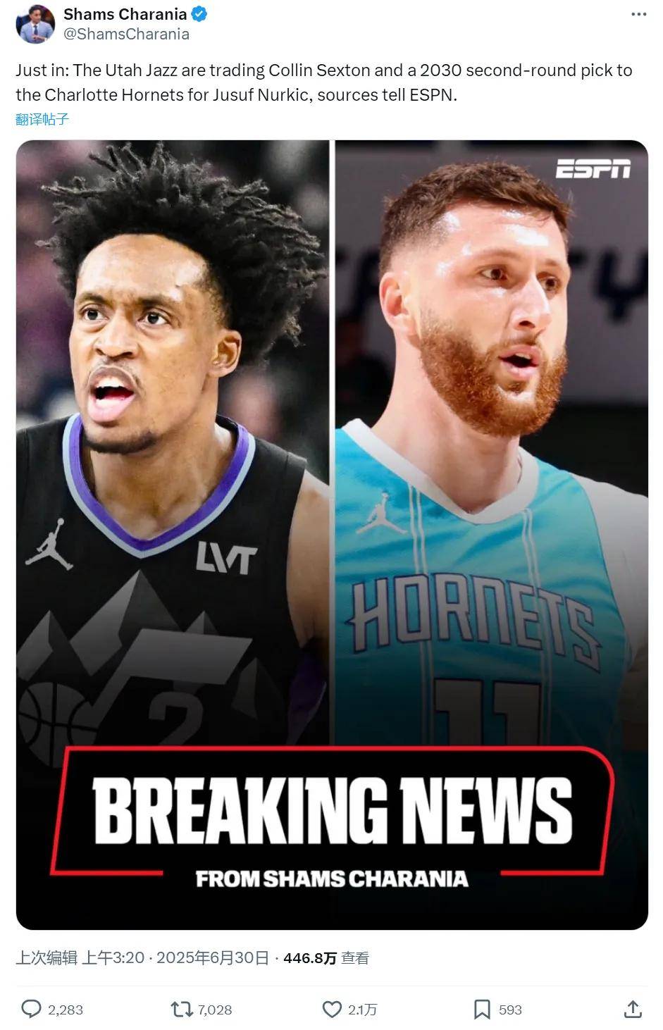 北京时间6月30日,NBA有不少交易和签约的新闻,教主帮大家捋一捋。先来说一笔交易:NBA名记Shams报道,爵士队用塞克斯顿和2031年次轮签,2换1从黄蜂交易得到努尔基奇。很多球迷不能理解,为何爵士还要倒贴选秀权?