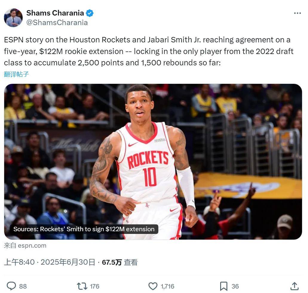 北京时间6月30日上午,火箭再次出手:NBA名记Shams报道,小贾巴里-史密斯和火箭签下5年1.22亿美元提前续约合同。这份合同全额保障,没有任何球队和球员选项。小贾目前还是4年4033万美元的新秀合同,2026年夏天到期。