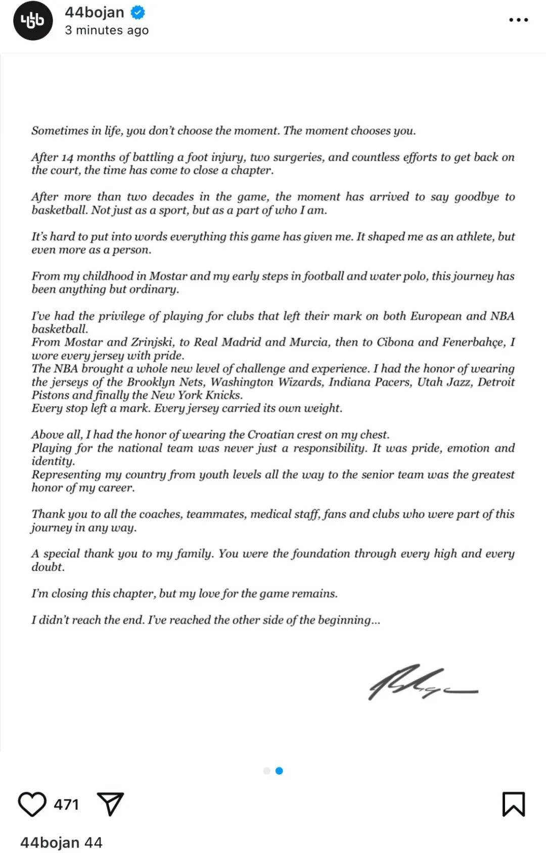 博扬写道:“从莫斯塔尔、日林斯基,到皇家马德里和穆尔西亚,再到锡波纳和费内巴切,我自豪地穿过每一件球衣。进入NBA之后,我有幸穿上过篮网、奇才、步行者、爵士、活塞和尼克斯的球衣,每一段征程都留下了印记。”