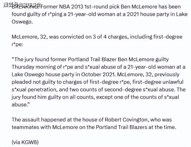 前NBA球员、本曾被寄予厚望的2013年首轮7号秀本-麦克勒莫,被美国法院裁定一级强奸罪和一级非法性侵罪成立,可能面临长达8年的监禁。