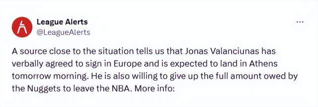 7月4日,据美媒《League Alerts》爆料,NBA老将中锋瓦兰丘纳斯决定结束自己的NBA生涯,重返欧洲赛场。