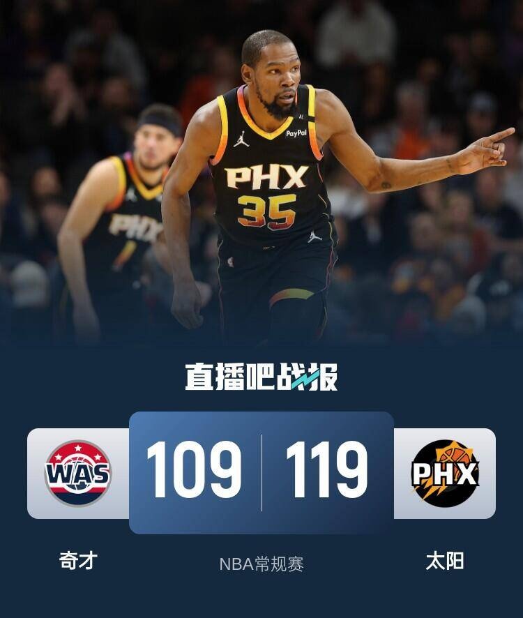 比赛开始,太阳新秀瑞安-邓恩有崴脚受伤,库兹马里突外投单节上双撑起球队进攻,太阳接连三分命中轰出17-2攻击波一举建立双位数领先,次节太阳突然陷入近4分钟得分荒,奇才开始追分,理查兹接连前场篮板补篮,随后太阳三巨头轮番取分半场领先15分。下半场,普尔连三分加助攻加抢断带队追分,奇才全民皆兵一度追到差4分,但杜兰特连砍7分带队回应9-2稳住双位数领先,末节奇才依靠外线三分继续追分,但太阳总能回应且牢牢保持住双位数领先,库兹马接连取分追到差4分,但太阳接连罚球杀死比赛,最终太阳119-109力克奇才,送对手13连败。