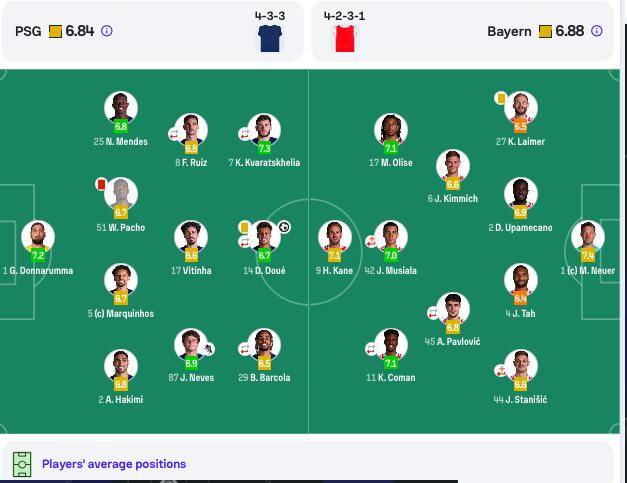 巴黎首发:1-多纳鲁马、2-阿什拉夫、5-马尔基尼奥斯、25-门德斯、51-帕乔、8-法比安、17-维蒂尼亚、87-若奥-内维斯、7-克瓦拉茨赫利亚、14-杜埃、29-巴尔科拉。