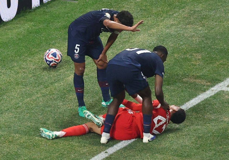 上半场结束前,穆西亚拉与出击的多纳鲁马撞在一起,穆西亚拉的左脚被多纳鲁马的壮硕的身躯身体压在下面,严重变形。