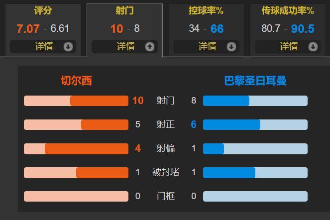 全场比赛,切尔西控球率也只有34%,10次射门、5次射正;巴黎8次射门、6次射正。在进攻效率方面,巴黎此役做的不如切尔西。