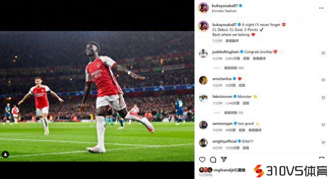 赛后萨卡也在团体社媒晒出本场庆贺进球的照片,配文写道:“这是一个我永生难忘的夜晚,欧冠首秀,首个进球,全取三分!回到了属于我们的舞台!”