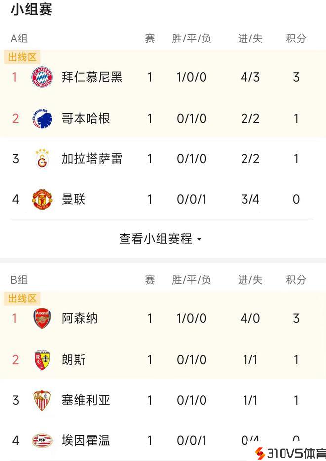 红魔堕入连败,阿森纳、曼城为英超球队挽回颜面,枪手主场4-0大胜埃因霍温,上半场枪手就攻入了3球提早杀死竞赛,萨卡、特罗萨德和热苏斯破门,下半场厄德高如虎添翼。曼城主场3-1打败贝尔格莱德红星,顺利取得开门红,阿尔瓦雷斯双响,罗德里-埃尔南德斯建功。英超的另一支球队纽卡斯尔联0-0战平AC米兰。