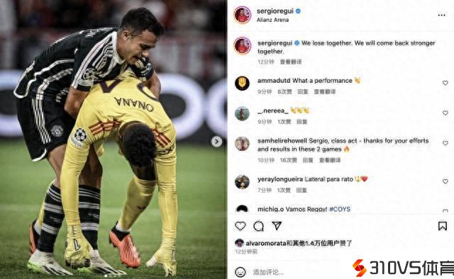 曼联在欧冠小组赛首轮3-4不敌拜仁,雷吉隆在社交媒体晒出抚慰奥纳纳的图片鼓舞球队。