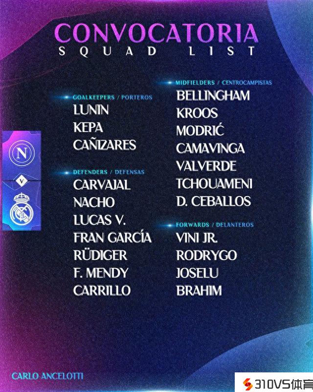 北京时间10月4日清晨3:00,2023-24赛季欧冠小组赛C组第2轮,皇家马德里将在客场应战那不勒斯。赛前,皇马官方发布了本场竞赛球队大名单,维尼修斯领衔进攻线,莫德里奇和克罗斯坐镇中场。