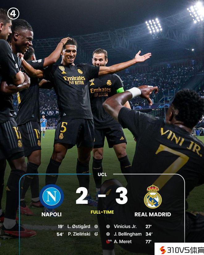 C组,皇马客场3-2逆转那不勒斯。厄斯蒂高头球首开记载,贝林厄姆助攻威尼修斯扳平,之后又一条龙抽射破门,杰林斯基点球扳平,巴尔韦德第79分钟世界波制胜。