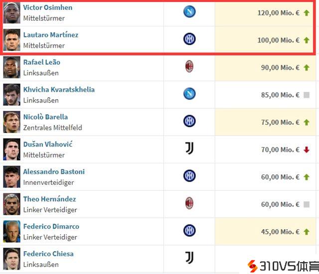 据悉,奥斯梅恩目前的身价是1.2亿欧元,他也是意甲身价最高的球员,此外劳塔罗如今1亿欧元。本赛季,劳塔罗在意甲曾经打进10球,目前排名射手榜第一,而奥斯梅恩进球6个,排名第二,这2人的表现,确实配得上自己的身价。