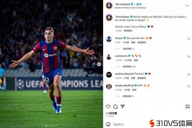 赛后费尔明也在团体社媒晒出本场庆贺进球的照片,配文写道:“在主场渡过梦境的夜晚,为了球队的成功,且我能为此出一份力而感到快乐!感谢大家,巴萨万岁!”