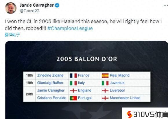 在2005年的金球奖排名中,卡拉格与C罗并列第20名。卡拉格激动地要求CBS发到网上,自己也转发调侃:“我在2005年赢得了欧冠冠军,就像这赛季的哈兰德。他会有和我事先一样的感受,被抢劫了。”