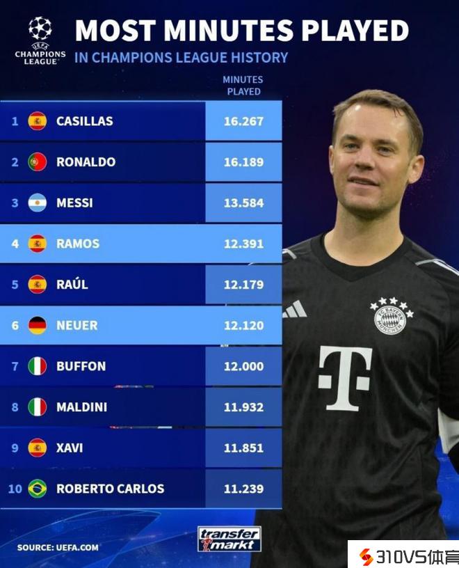 德转清点了欧冠历史出场时间最长的球员榜单,其中卡西利亚斯居首,C罗次席,梅西第三,本赛季仍无时机出战的为拉莫斯以及诺伊尔,以下为详细榜单: