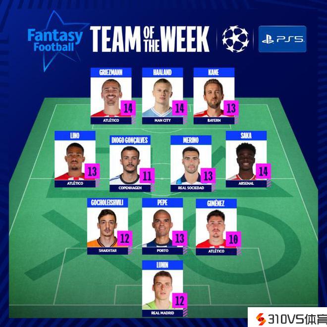 欧冠小组赛第4轮竞赛完毕,(欧冠)官方给出了本轮最佳阵容,凯恩、哈兰德、萨卡、老将佩佩在列,格列兹曼等马竞三将中选。