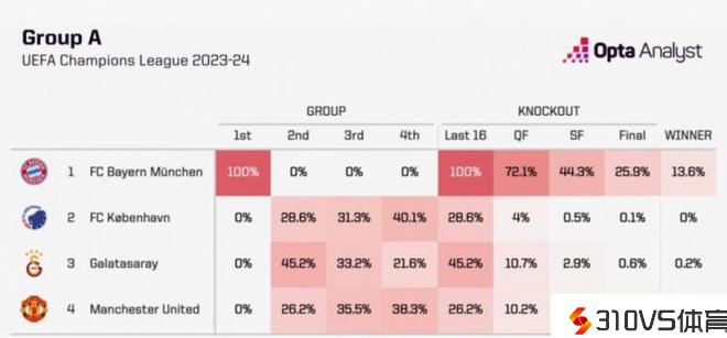 数据网站OPTA也对本小组的出线情势作出预测,其中曼联取得小组第二的概率只要26.2%,低于加拉塔萨雷(45.2%)以及哥本哈根(28.6%),而曼联取得小组第三的概率为35.5%,取得小组第四的概率为38.3%。