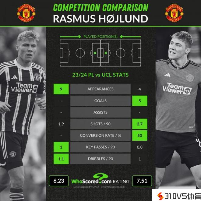WhoScored统计了霍伊伦本赛季在英超和欧冠的数据,并作出对比,他在英超9场0进球,欧冠4场打进5球。