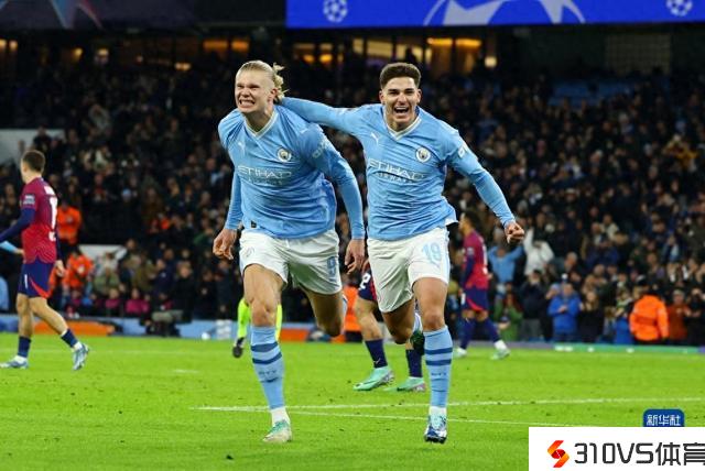 11月28日,曼彻斯特城队球员阿尔瓦雷斯(右)在竞赛中进球后与队友哈兰德庆贺。新华社/路透