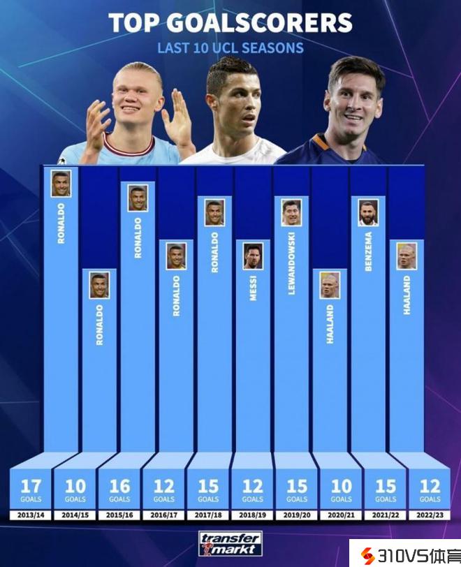 本赛季欧冠正在停止之中,哈兰德目前5场5球并列射手榜榜首,德转也清点了近10个赛季欧冠金靴奖,其中C罗单赛季17球最多,详细状况如下: