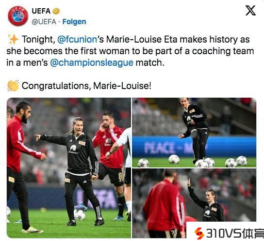 在昨晚对阵布拉加的竞赛中,她再次发明历史:成为首位在女子欧冠竞赛中在场边担任助教的女性。欧足联官网也在社交媒体上向这位32岁的助教表示祝贺:“今晚,柏林联的玛丽-路易斯-埃塔发明了历史,她成为首位在一场女子欧冠竞赛中担任教练组成员的女性。祝贺你,玛丽-路易斯!”