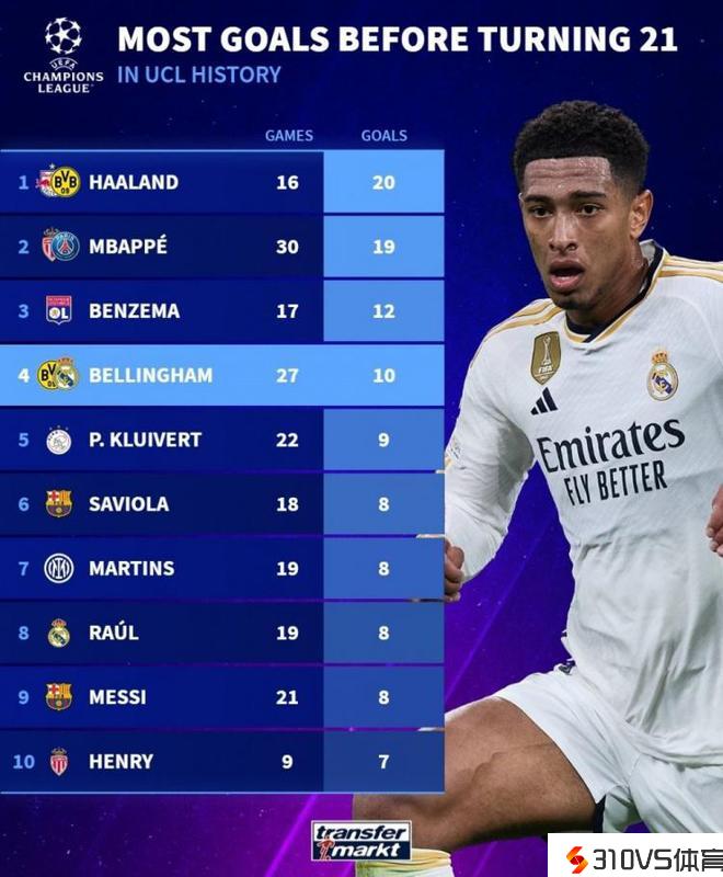 德转清点了在21岁前欧冠历史进球榜,其中哈兰德20球居首,贝林厄姆目前已打进10球位列第四,以下为详细榜单: