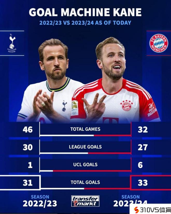 德转也对比了凯恩本赛季与上赛季效能热刺时期的进球数据,详细如下: