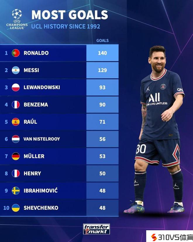 德国转会市场统计了欧冠历史射手榜,其中,C罗以140球高居榜首,梅西129球第二,莱万和本泽马区分以93球和90球排在第三第四。