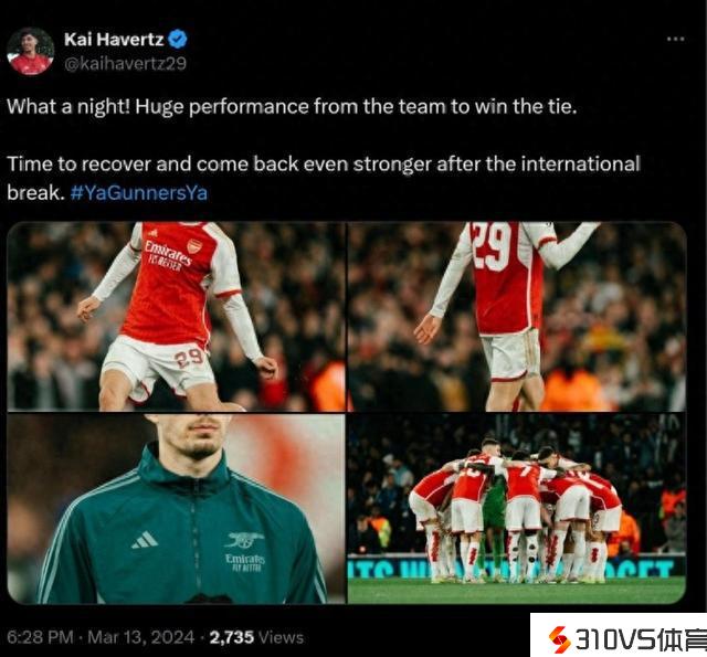 欧冠1/8决赛次回合,阿森纳点球大战中淘汰了波尔图,晋级8强。赛后,哈弗茨更新社媒,庆贺球队闯入1/4决赛。